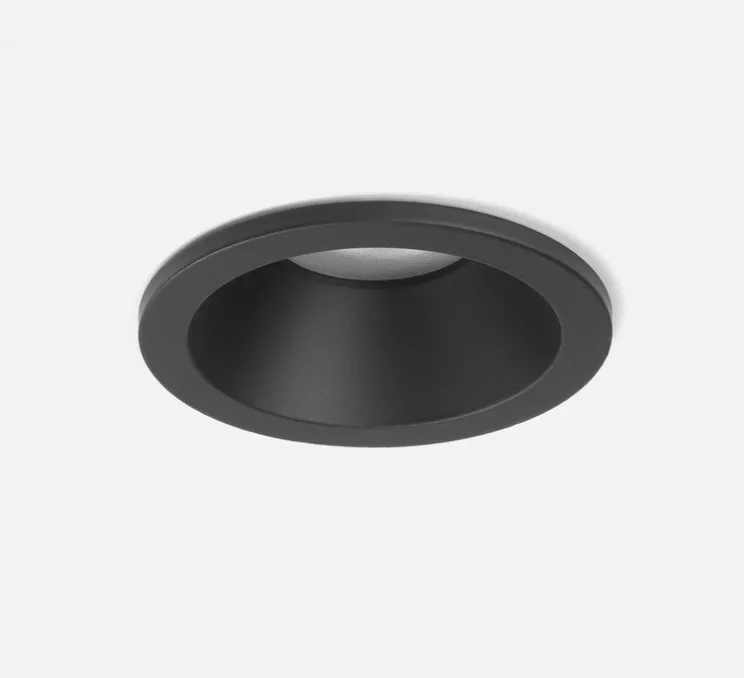 Cet encastré de plafond est conçu pour l’ intérieur ou l’extérieur, incluant les salles de bain. Il est de forme ronde et en retrait avec une finition noir mat.
