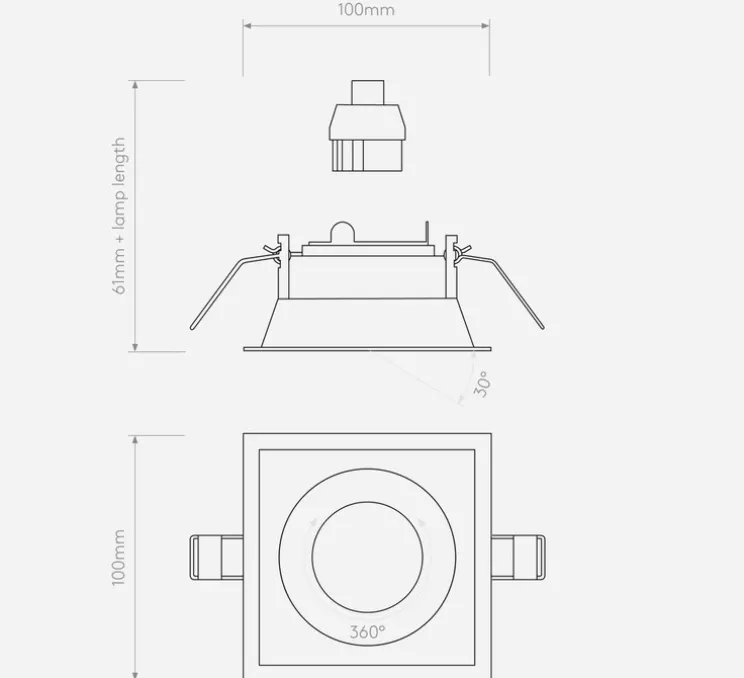 Le spot mesure 6,1 cm de hauteur, 10 cm de côté et pèse 0,36kg. La source lumineuse GU10, d’une puissance maximale de 6W n’est pas incluse. Le produit est homologué anti-incendie. Variable selon le type d’ampoule. La profondeur de l’encastrement est de 15cm. Montage au plafond.