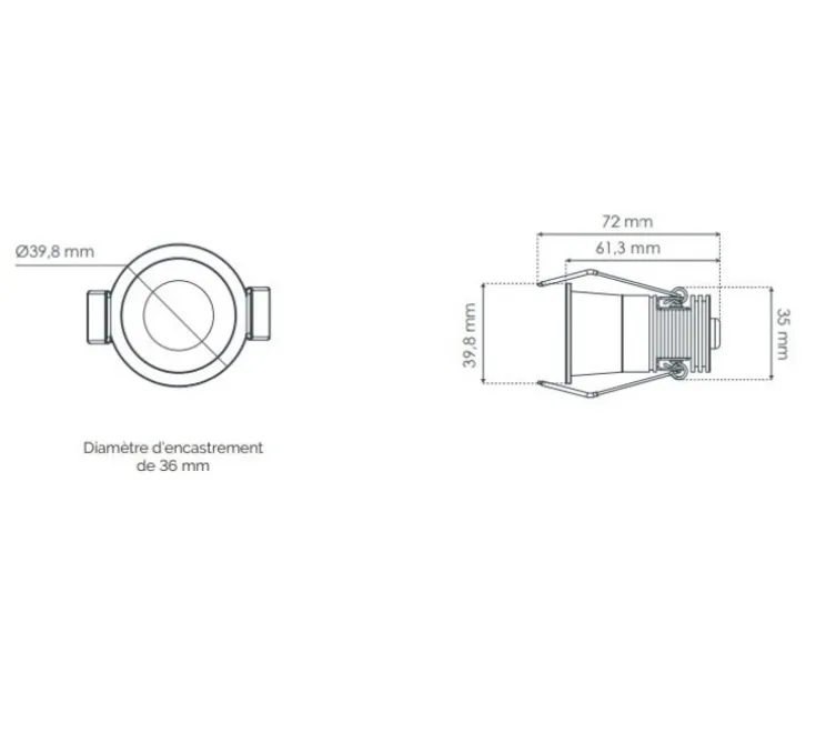 Le diamètre d’encastrement est de 36 mm. Lorsqu’il est installé, le spot est IP65 sur la face avant, faisant de lui un spot idéal pour les lieux humides de type salle de bain, caves ou encore cuisines.