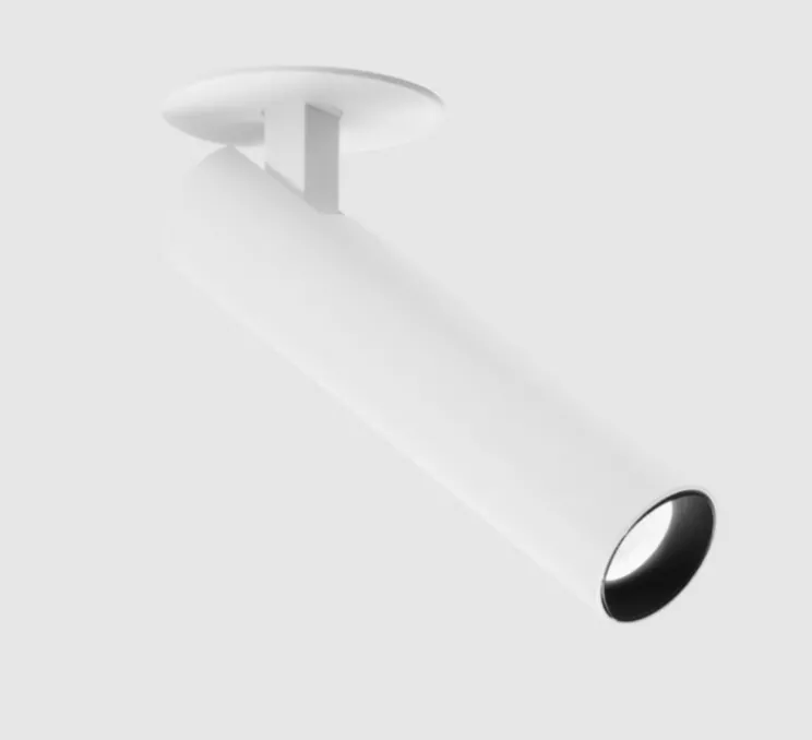 Il se compose d’une fixation encastrable sur laquelle est positionné un spot orientable. Le spot est cylindrique et peut s’orienter dans différentes directions. Pour faciliter l’orientation du spot, celui-ci est relié à la fixation par une petite tige.