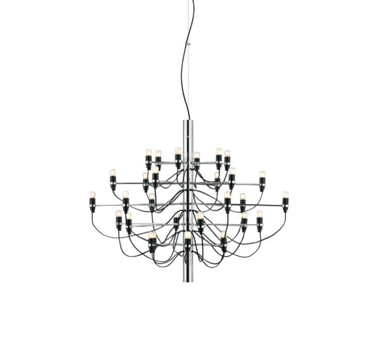 2097/30 est une suspension à lumière diffuse composée d’une structure centrale en forme de tube faite de fer, de laquelle partent trente bras en laiton, chacun accueillant une ampoule. 2097 a la silhouette d’un chandelier classique et une allure moderne. Raffiné et iconique, 2097 s’intègre dans tous les intérieurs, qu’ils soient privés ou publics, classiques ou modernes, que la suspension soit utilisée dans un salon, au-dessus d’une table ou dans une entrée.