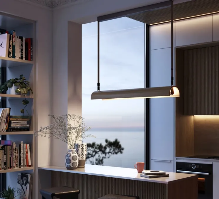 Aluet a été conçue pour apporter plus de chaleur que les luminaires de bureaux classiques. La suspension se compose d’un abat-jour linéaire en bois qui donne de la chaleur au produit et à son environnement. Ce luminaire habille les espaces pour les rendre plus accueillants. Initialement pensée pour les espaces de travail, Aluet est idéale au dessus d’une table, d’un bureau ou d’un bar.