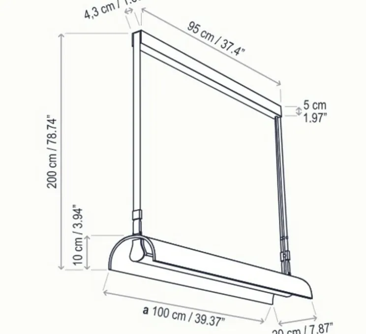 Le luminaire mesure 100cm de longueur et 10cm de hauteur. La source LED 2700K, 4200lm, 34W est incluse.