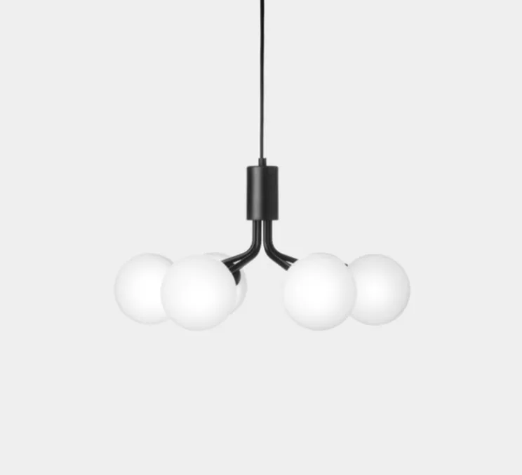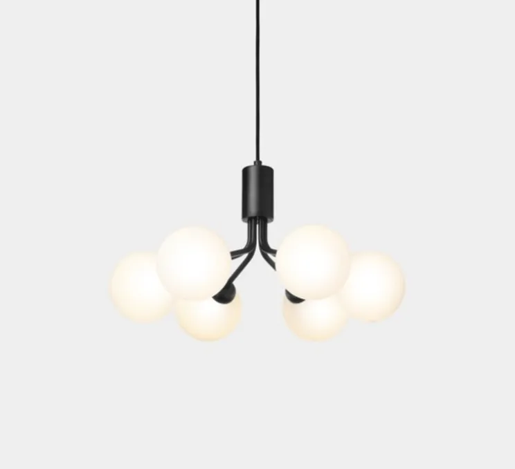 Sofie Refer s’est inspirée de la nature scandinave, les 6 bras de la suspension Apiales rappellent les tiges d’un bouquet d’où la lumière se diffuse gracieusement au travers des globes opalins en verre soufflés à la bouche.