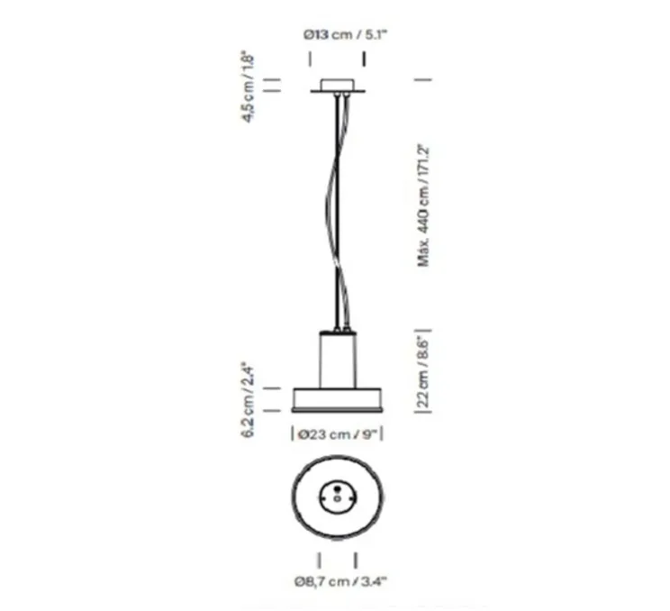 La suspension mesure 23cm de diamètre et 22cm de hauteur. La source lumineuse 2700K, 2471lm est incluse.
