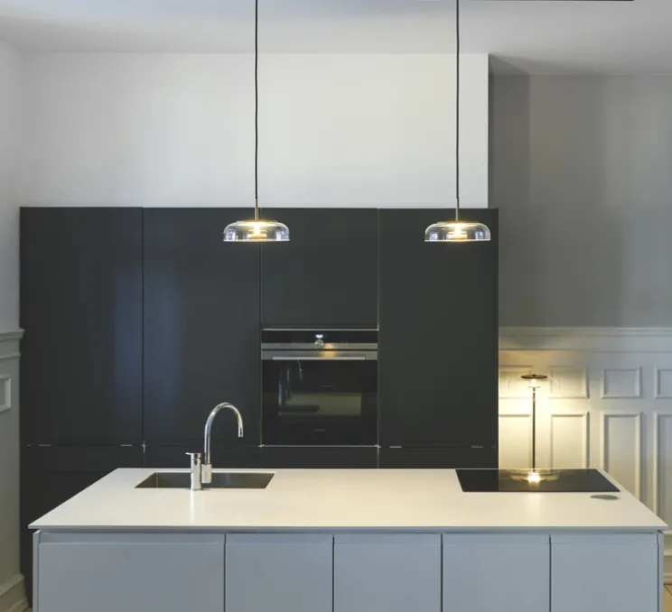 Cette suspension innovante est réalisée avec la toute dernière technologie LED. Grâce à un disque LED spécialement développé, la lumière se reflète dans l’abat-jour en verre soufflé à la bouche et dans le métal doré, offrant ainsi un éclairage indirect doux et sophistiqué.