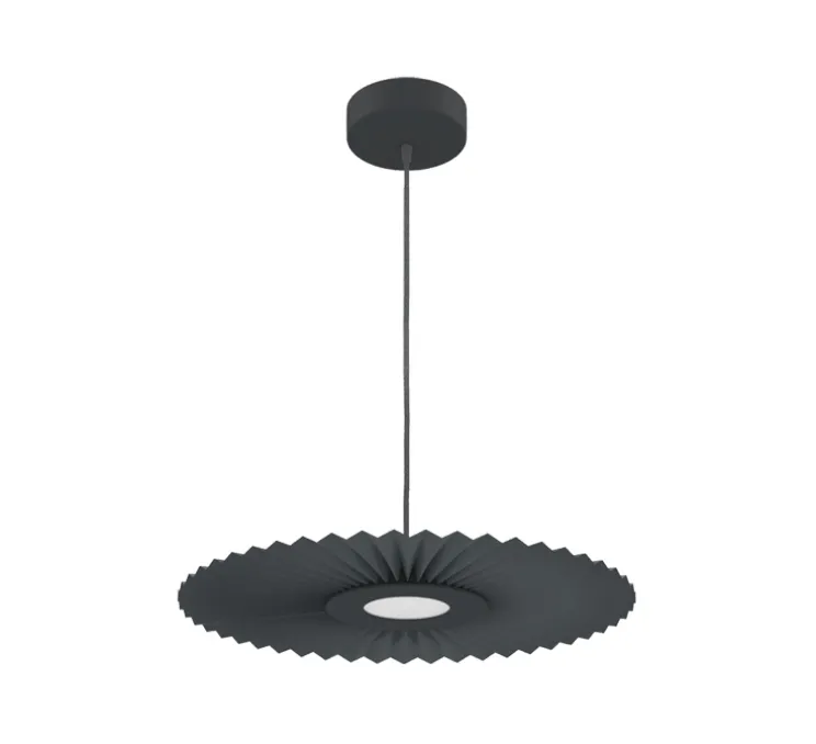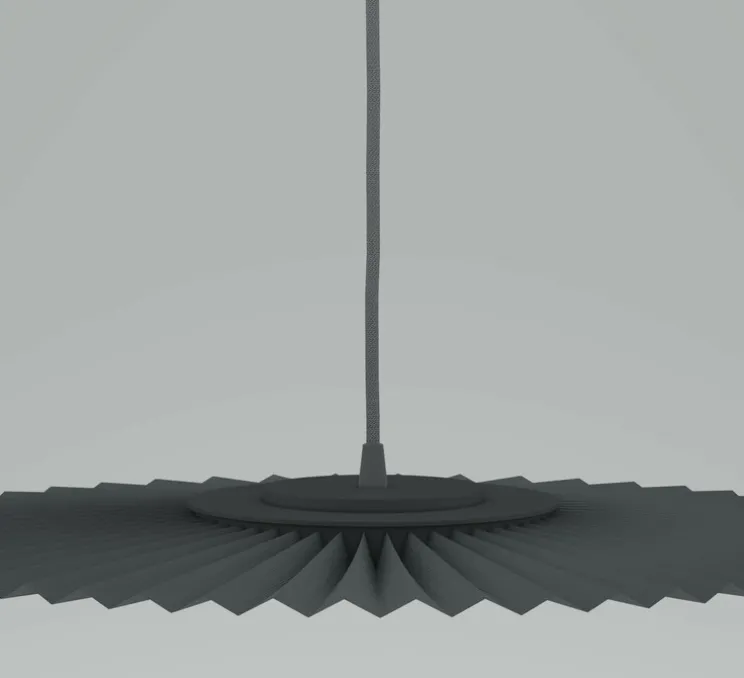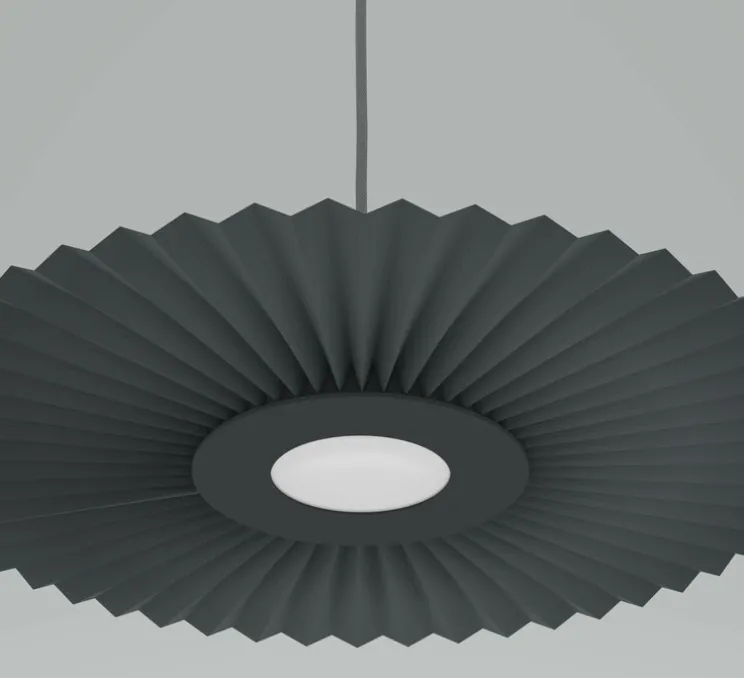 Elle est réalisée en métal laqué mat et d’un tissu plissé de couleur grise.