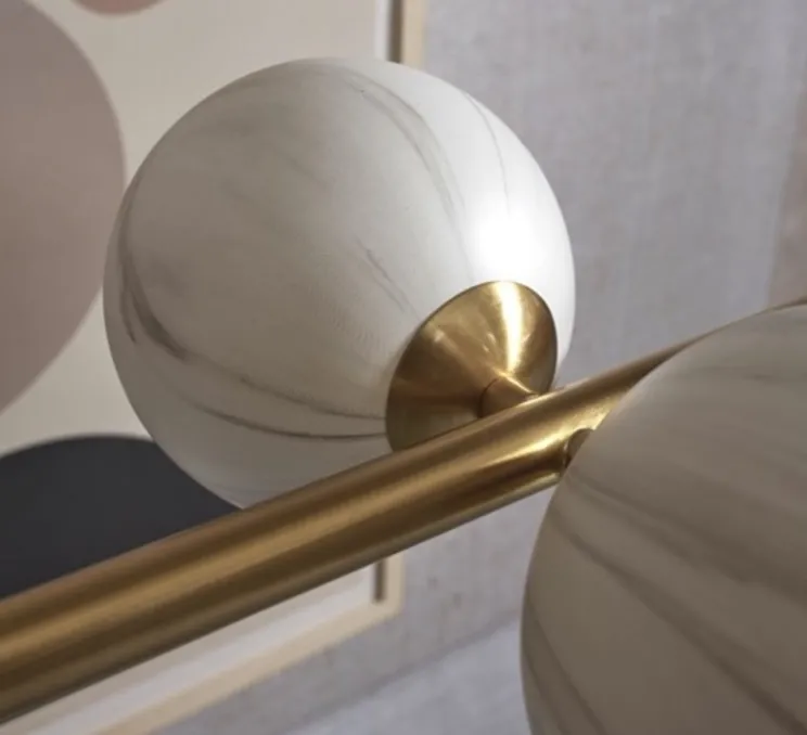 Ce joli lustre composé de 6 sphères en verre à la finition en marbre blanc ainsi que d’une base en laiton, habille votre intérieur avec élégance.