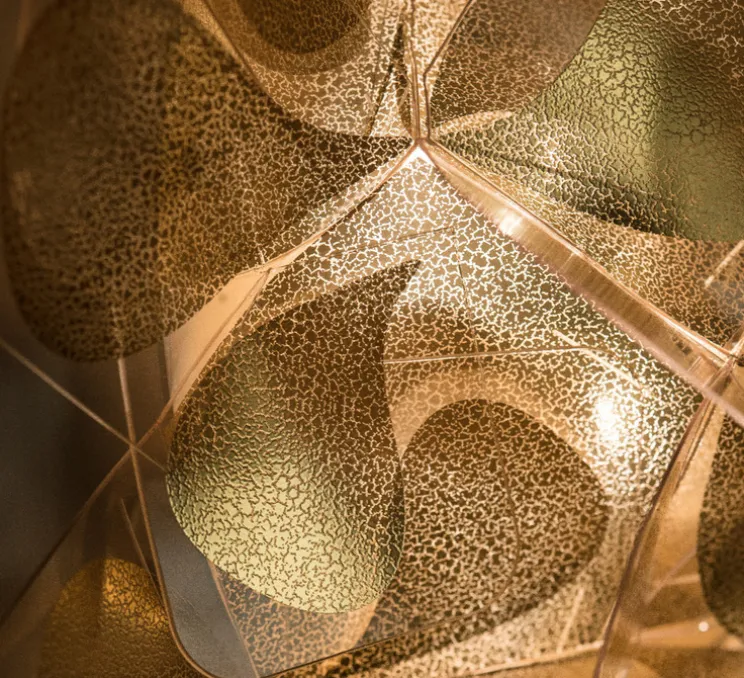 La couleur or est le résultat de recherches incessantes et d’un procédé jamais utilisé jusqu’à présent : l’application à froid d’un foil double face sur le technopolymère Slamp. La texture effet craquelé permet au pétale d’être plus résistant, laisser passer la lumière et créer de délicats effets d’ombre.