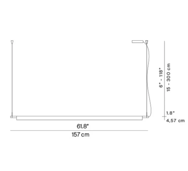 Les dimensions de la suspension sont de 157 cm pour la longueur et 4,57 cm de hauteur. Le câble noir est fourni et mesure entre 15 et 300 cm. La source de lumière est incluse : LED 33W, 3000K.