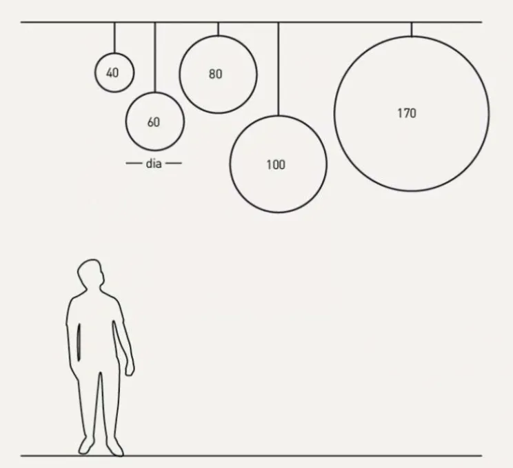 La suspension mesure 40cm de diamètre et 40 cm de hauteur. L’ampoule Led E14 d’une puissance de 11W maximum n’est pas fournie mais est recommandée pour le bon fonctionnement du luminaire. Rosace non fournie. L’abat-jour est vendu en kit afin de minimiser l’empreinte carbone lors du transport. Possibilité d’assembler la couleur à l’extérieur ou à l’intérieur.