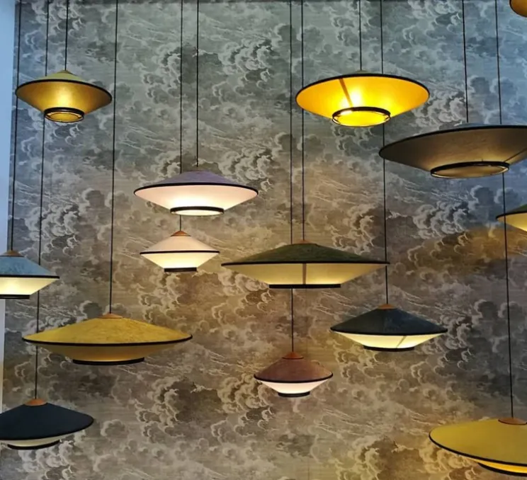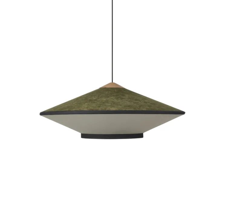 Grâce aux matériaux utilisés, Cymbal apporte une véritable touche japonaise à votre intérieur. L’abat-jour est conçu en velours pour la partie supérieure et en tissu pour la partie inférieure. Cet effet de matières permet de distinguer clairement les deux cymbales symbolisées par la suspension. Le diffuseur répand ainsi une lumière tamisée renforçant la légèreté du luminaire. Cymbale existe en 50cm de diamètre, 70cm ou 95cm et dans diverses couleurs : vert, bleu atlantique, bleu nuit, rose poudré, naturel, or ou bronze.