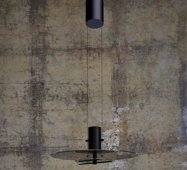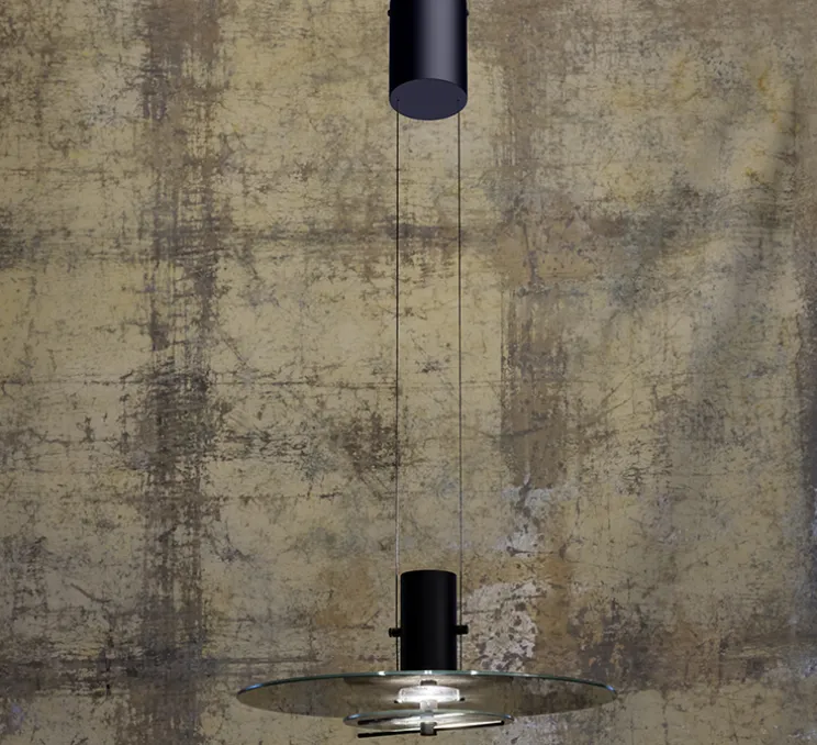 Le luminaire Delumina est composé d’une rosace, de deux câbles et d’un abat-jour fait d’un élément tubulaire, de deux disques de verre transparent de tailles différentes et d’une baguette métallique pivotable, permettant de noircir le verre inférieur. Envoutante et évolutive, la suspension Delumina suit chacun au grès de ses envies et besoins, se plaçant aussi bien au-dessus d’une table, que dans une pièce de vie ou un bureau.