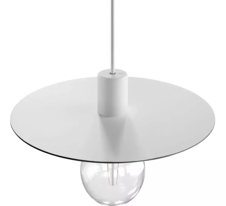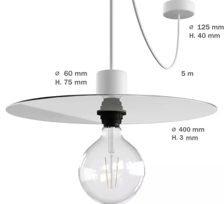 Eiva Elegant mesure 40 cm de diamètre pour 7,5 cm de hauteur. L’ampoule Led E27 d’une puissance maximale de 6W n’est pas fournie mais est recommandée pour le bon fonctionnement du luminaire. Douille et rosace en silicone.
