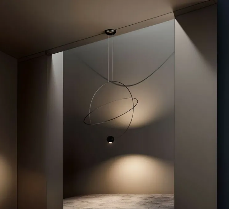 Avec sa forme circulaire et son fini noir brillant, cette suspension ajoute une touche de sophistication à tout intérieur. La structure, suspendue par deux câbles fins et dotée de deux arceaux croisés, crée un jeu de lumière captivant, projetant des ombres dynamiques qui évoluent avec le passage du jour. Le diffuseur en sphère noire mate offre un contraste subtil, tandis que les deux éclairages, orientés vers le sol et le plafond, permettent de jouer avec les ambiances lumineuses. Idéale pour les pièces de haut plafond, cette suspension signée Nika Zupanc habille l’espace avec élégance.