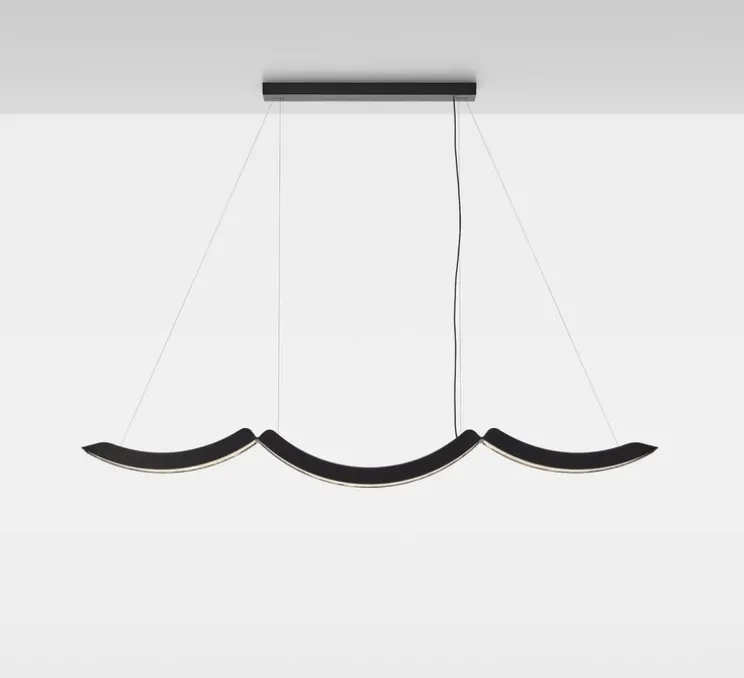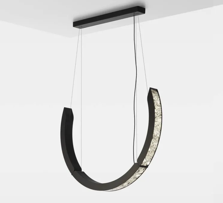 Elo se distingue grâce à plusieurs innovations techniques. La suspension se compose de métal et du verre Brokis. Il s’agit d’un verre recyclé qui offre un effet lumineux incomparable grâce aux jeux de lumières produits par la texture du verre. Ce luminaire comprend 3 arcs reliés entre eux par une articulation qui permet une variété de positions. Les 2 arcs extérieurs peuvent être positionnés presque à l’horizontal pour que l’ensemble forme un demi-cercle.