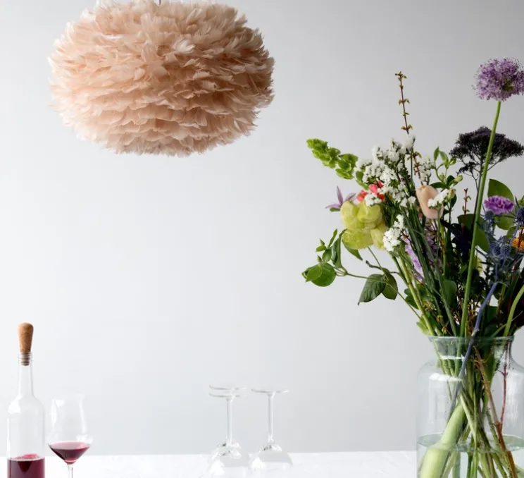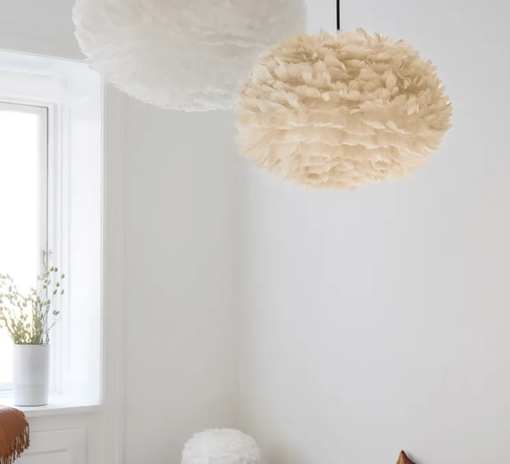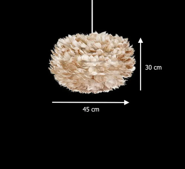 Cette superbe création signée Soren Ravn Christensen pour la maison de design danoise, Vita Copenhagen – Umage, est composée d’un très bel abat-jour en papier, habillé avec environ 1800 plumes d’oie, d’une hauteur de 30cm et avec un diamètre de 45cm.