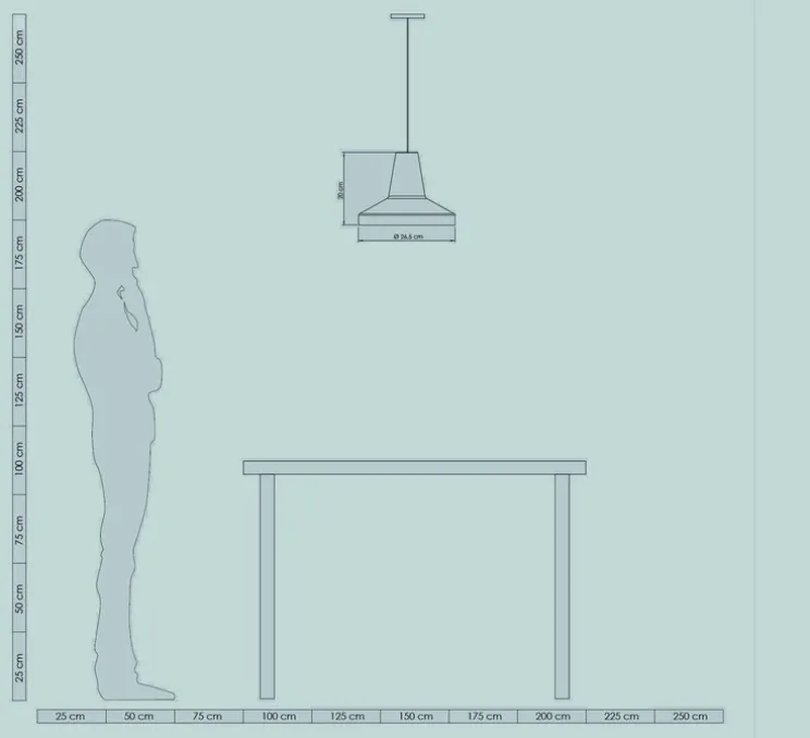 Famara mesure 26,5cm de diamètre et 20cm de hauteur. La source lumineuse n’est pas incluse. Nous vous préconisons une ampoule LED E27, 13W max. Le câble noir de 7m est inclus.
