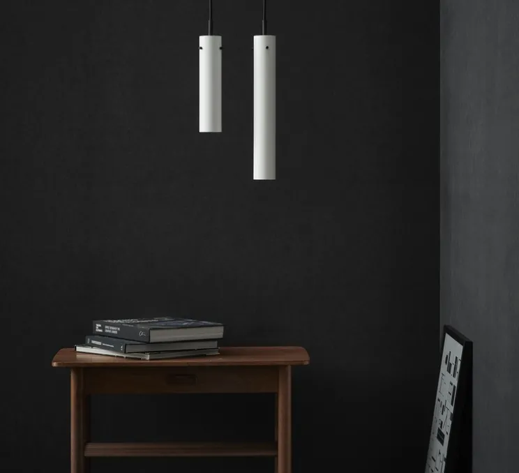 Cette suspension mesure 24cm de hauteur et a un diamètre de 5,5cm. FM2014 est disponible en deux tailles et deux coloris, noir et blanc. Le câble en tissu noir mesure 300cm.