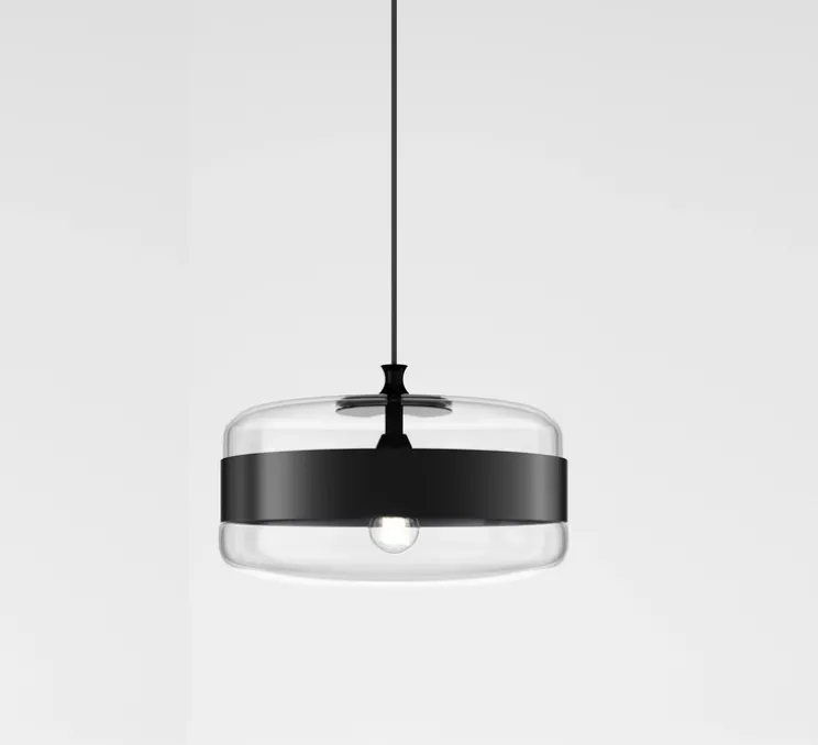Ce luminaire unique présente un verre cristal transparent avec un anneau en cuivre ou noir mat, créant un contraste saisissant et mettant en valeur l’élégance du verre soufflé. La transparence du verre permet à la lumière de se diffuser de manière douce et uniforme dans l’espace, créant une atmosphère chaleureuse et accueillante.