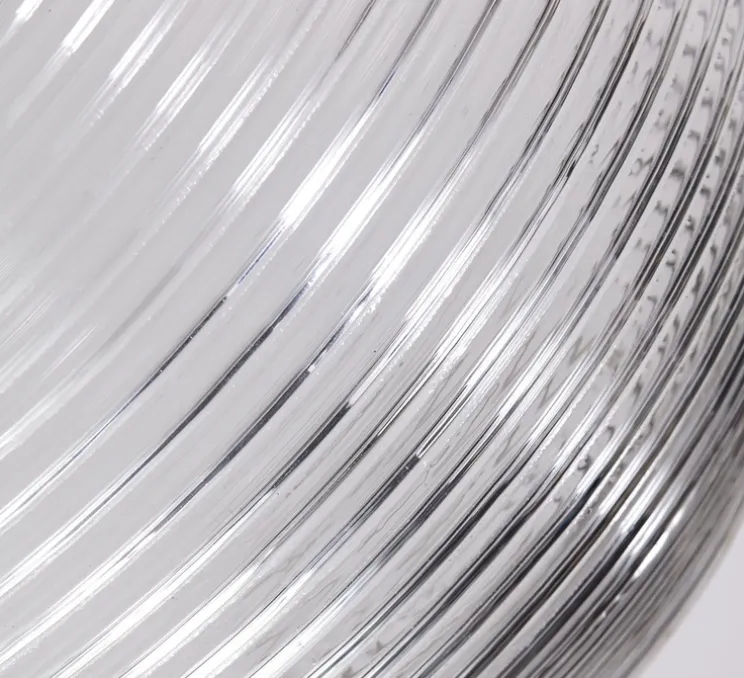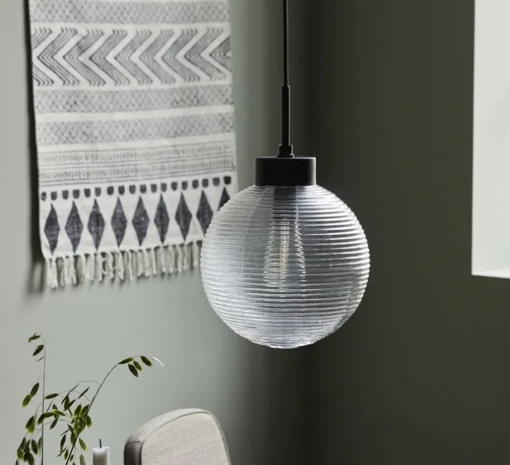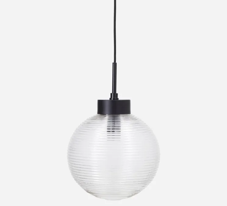 Cette jolie suspension ronde conçue à partir de verre nervuré apporte de l’élégante à votre intérieur. Le verre est couplé au fer qui amène une touche industrielle.
