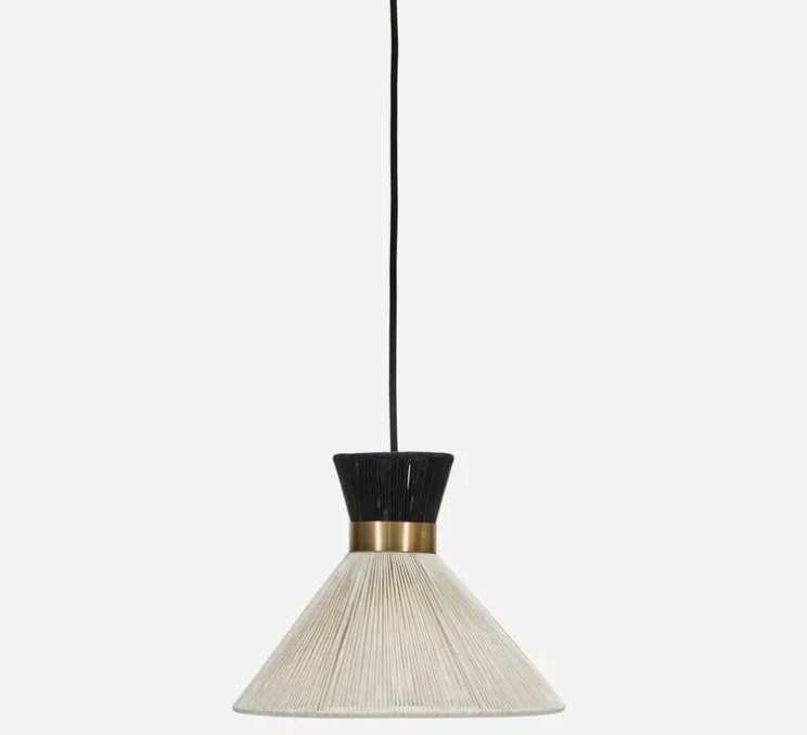 Cette suspension se distingue par son abat-jour original enveloppé de fils polyester noir et blanc, qui ajoute texture et contraste. Sa structure élancée et ses finitions en fer et laiton en font un élément de caractère qui rehausse la décoration de votre espace. Idéal pour un salon, une cuisine ou un couloir, la suspension HDCord apporte une note de raffinement tout en restant sobre.