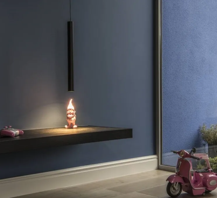 Ce tube minimaliste en aluminium, telle une allumette, se place au-dessus d’une table de séjour ou dans un salon, seul ou en grappe.