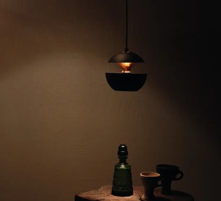 Here comes the sun 175 est une suspension très aérienne qui séduit par son coloris noir et son intérieur en cuivre. Elle apporte chaleur et douceur à votre intérieur grâce à une lumière douce où l’ampoule est complétement intégrée dans le corps de la lampe.