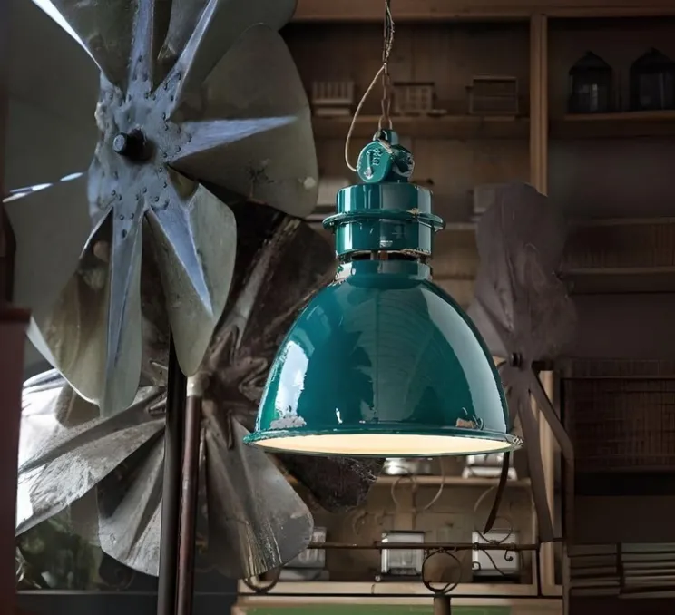 Représentatif de la collection Rétro de Ferroluce, ce luminaire reprend les codes industriels et colorés de la gamme.