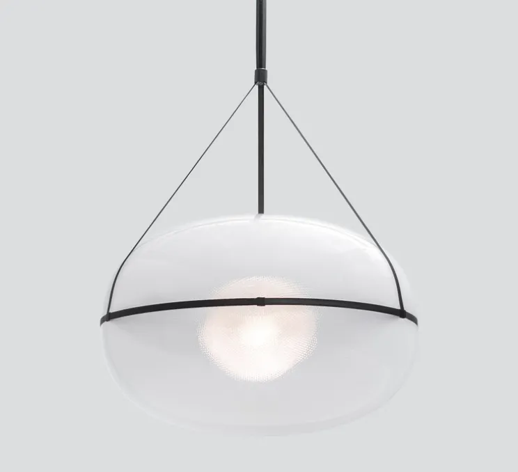 L’Iris associe deux formes – un profil A plus grand et un profil B plus petit, ce qui donne un total de quatre combinaisons possibles. La suspension est disponible dans une finition noire ou argentée.