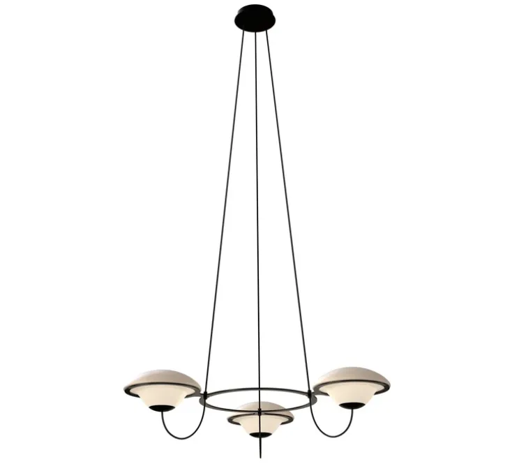 Avec ses lumières « ufoesques » qui évoquent l’imaginaire des comics américains et des films de science-fiction des années 50 et 60, ITA offre une présence forte. Inspiré par l’iconographie des soucoupes volantes, ce lustre se compose de trois modules lumineux, flottant sans ancrage sur des cercles métalliques. Sa forme biomorphique et son équilibre spatial rappellent les lumières totémiques des années soixante italiennes, créant une impression de lévitation opalescente dans votre espace. Le lustre ITA se distingue par son design profilé et son allure aérienne, apportant une touche de fantaisie nostalgique à tout intérieur.