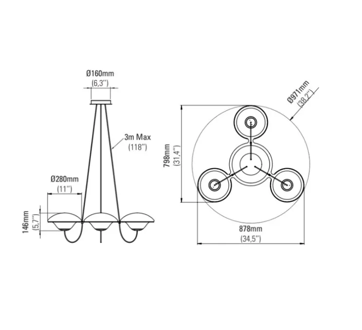 La suspension mesure 97,1cm de diamètre et 14,6cm de hauteur. Les sources lumineuses ne sont pas fournies. Nous recommandons 3 ampoules E27, 10W max.