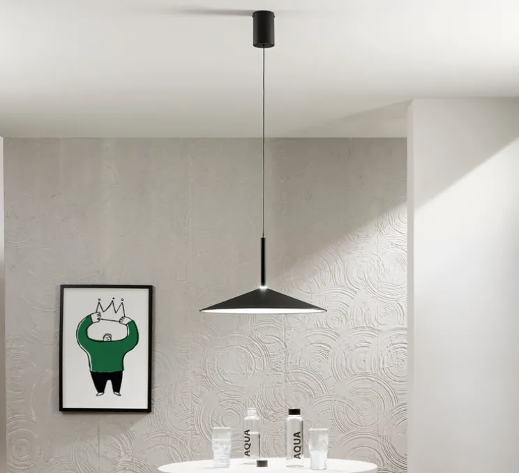 Son volume conique évoque la silhouette d’un chapeau traditionnel chinois, revisité avec des lignes épurées. Déclinée ici en noir, elle apporte de la légèreté visuelle à un intérieur, tout en affirmant une présence graphique. Elle trouve naturellement sa place au-dessus d’une table de repas, d’un îlot central ou dans un salon, en pièce unique ou en composition.