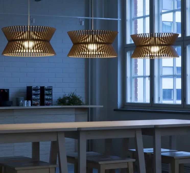 L’abat-jour exceptionnel de la lampe à suspension est en bouleau pressé certifié PEFC. Pour Secto Design, des experts ont produit cette silhouette en X unique à la main. Les nuances sont faites de lamelles de bouleau stratifiées reliées par des anneaux de contreplaqué d’avion.