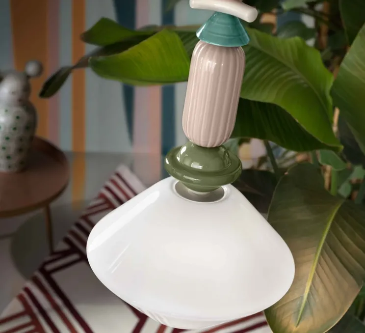 Céramiques de formes diverses et diffuseur en verre, telle est la composition de ce luminaire. En effet, il se présente comme un diffuseur en losange, fait de verre opalin et surmonté d’une multitude d’éléments en céramique de formes et couleurs variées. Cette disposition fait penser à un collier de sucreries à croquer.
