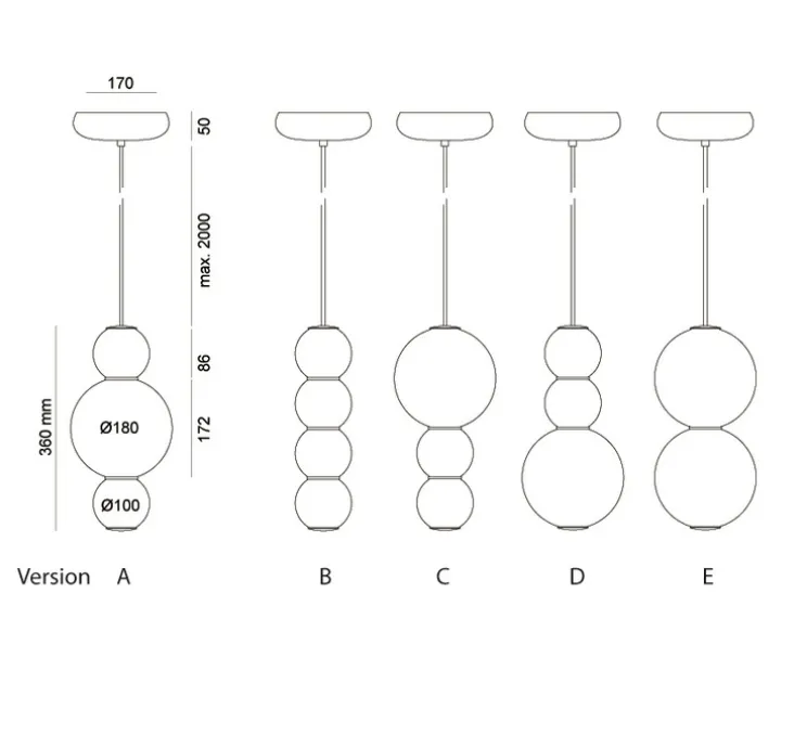 Cette suspension est composée de 2 sphères de Ø10cm et une de Ø18cm. Un câble en tissu blanc ajustable jusqu’à deux mètres surplombe ce luminaire.