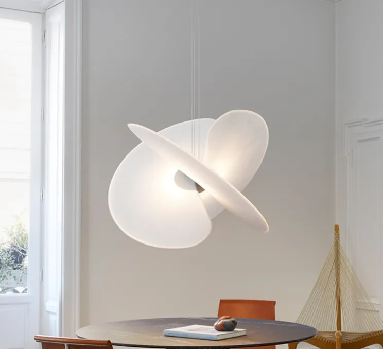 Il naît de l’intersection de trois grands ventilateurs, réalisés dans un matériau inédit pour le secteur du design et emprunté au monde de l’alimentation, à l’aspect similaire au papier de riz, pour diffuser la lumière de manière uniforme.