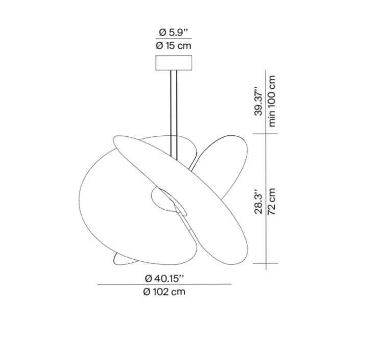 La suspension mesure 102cm de diamètre et 72cm de hauteur. Le module Led intégré d’une puissance de 54W a une colorimétrie de 2700K. Dimmable en coupure de phase. Possède un IRC de 90 promettant un rendu réaliste des couleurs.