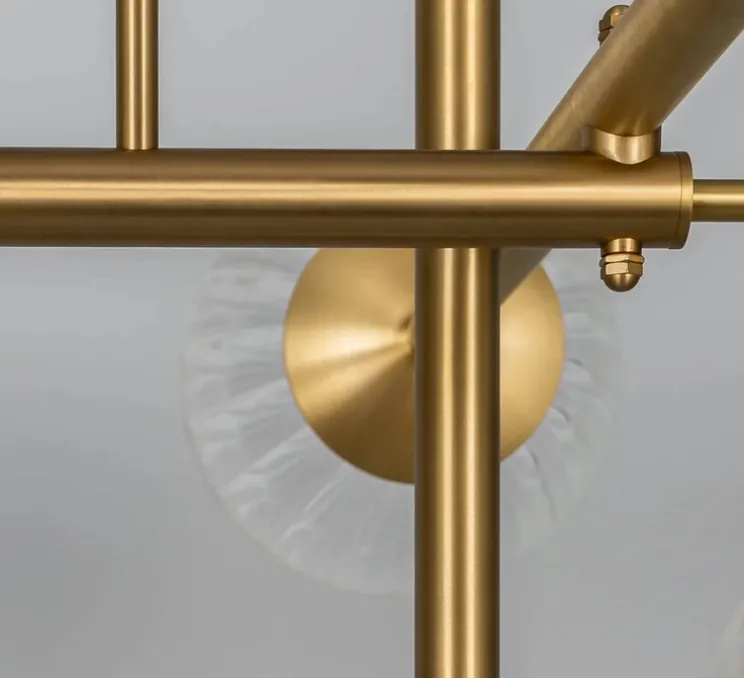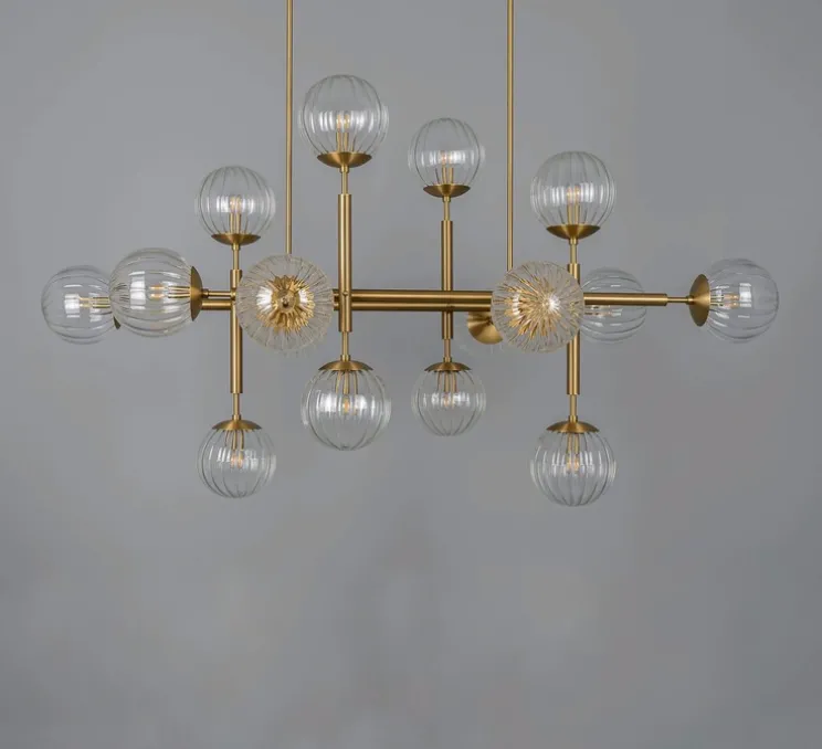 Ce lustre se compose de globes de verre sophistiqués autour d’une tige en laiton. La structure enchanteresse des orbes soufflés à la bouche crée une forme changeante qui change à chaque vue.