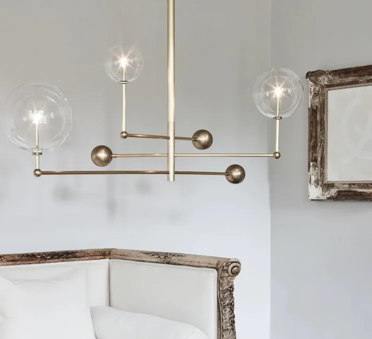 Ce lustre se compose de trois globes de verre éclairés qui gravitent autour d’un axe central. Les bras rotatifs en laiton évoquent la grâce mécanique de l’astronomie. Une pièce céleste où la précision rencontre l’élégance.