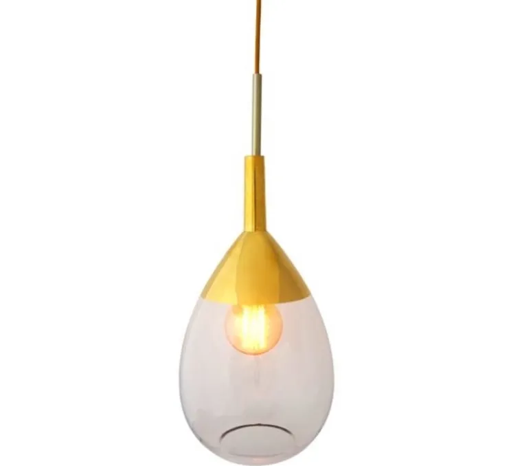 Ce luminaire nous fait penser à une énorme goute de pluie, mais celle ci apporte gaieté, chaleur et touche bohème chic dans votre salon, couloir, chambre ou cuisine. La suspension est faite de verre soufflé à la bouche vert, d’un chapeau en métal coloris or et d’un câble de 2 mètres maximum en textile.