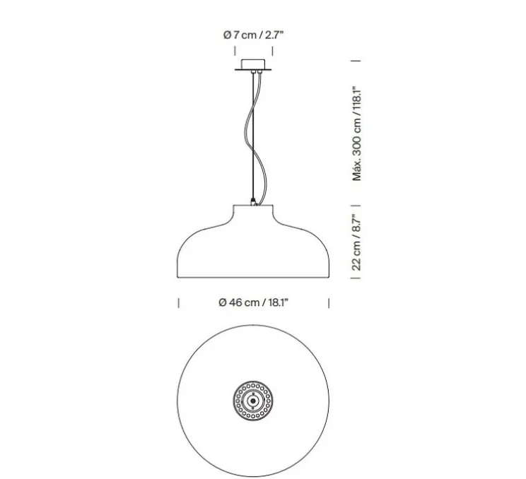 La suspension mesure 46cm de diamètre pour 22cm de hauteur.