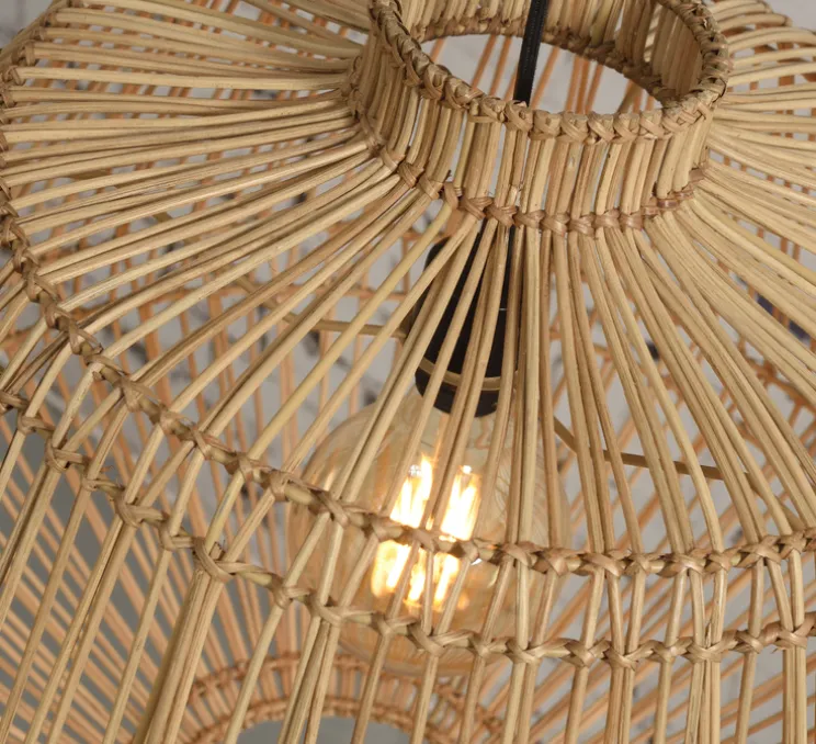 Ce luminaire très simple par sa forme et chaleureux par sa matière apporte une atmosphère tropicale grâce aux ombres projetées au travers des lamelles de rotin.
