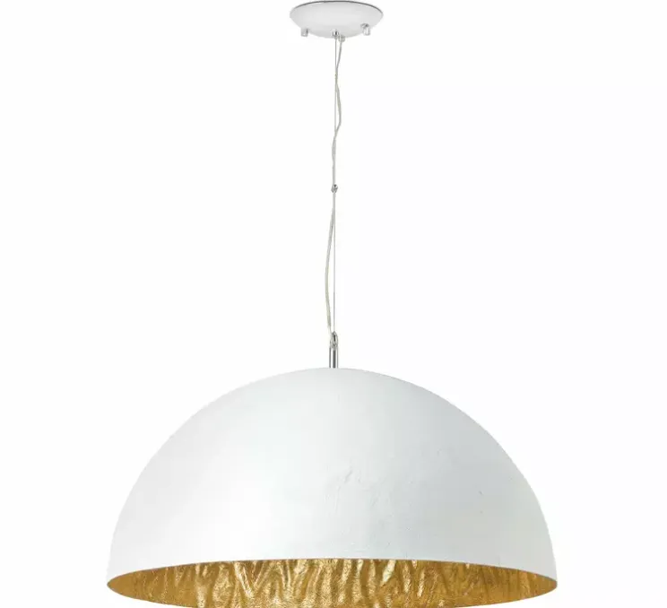 Fabriquée en acier de haute qualité avec des détails en fibre de verre, elle incarne une alliance audacieuse entre la sobriété du blanc mat et l’élégance intemporelle de l’or. Avec son design sphérique de Ø70cm x H32,5cm, cette suspension apporte une touche artistique à tout espace intérieur, ajoutant une note d’élégance Art Déco.