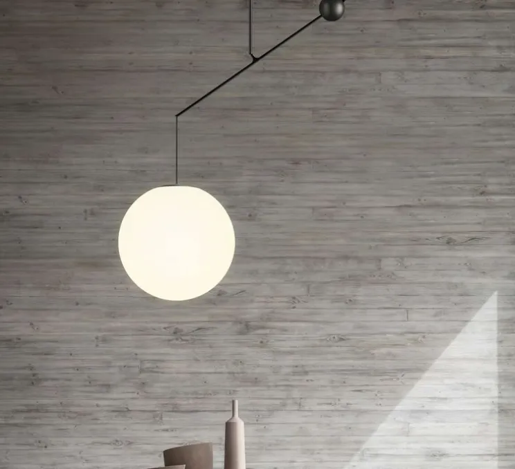 La lumière peut être utilisée dans différentes positions grâce à un contrepoids en forme de sphère et d’un bouton permettant le réglage. En appuyant sur ce bouton, un ressort est actionné et déplace le contrepoids vers le bas de la lampe et modifie ainsi la position du diffuseur. La suspension est idéale pour les grands espaces tels qu’un salon, une salle à manger ou encore une chambre à coucher.