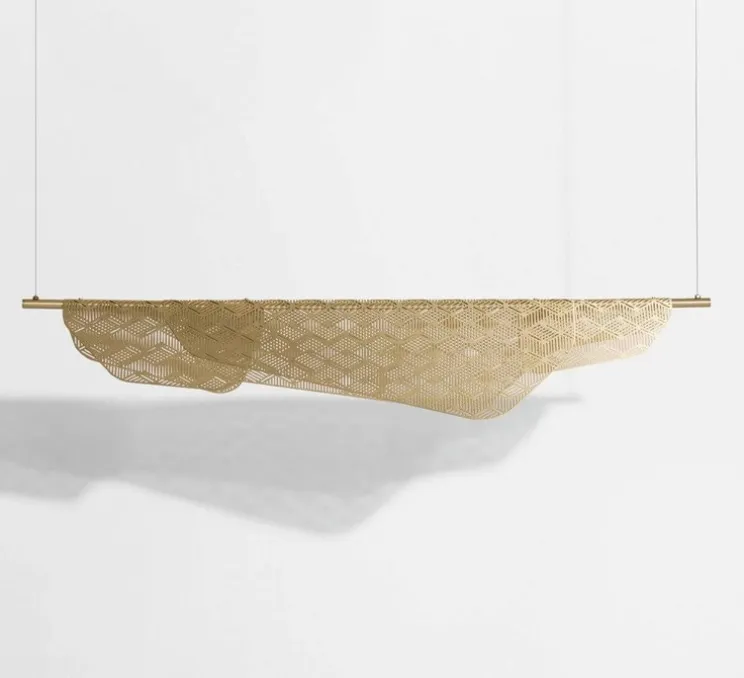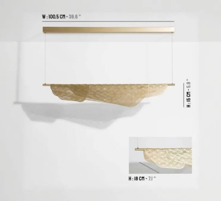 Inspirée par la légèreté d’un linge flottant aux fenêtres des balcons méditerranéens, cette suspension se compose d’une fine feuille de laiton brossé, délicatement perforée de motifs géométriques. Ce design unique sculpte et diffuse la lumière, créant une ambiance douce et chaleureuse dans votre intérieur.