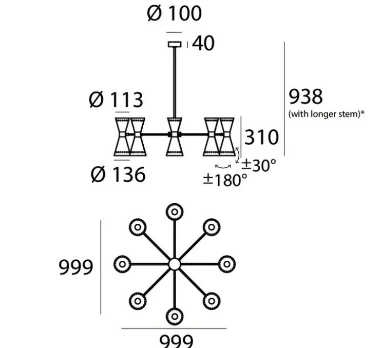 Disponible en diamètre 79 avec 6 abat-jour ou 99 avec 8 abat-jour.