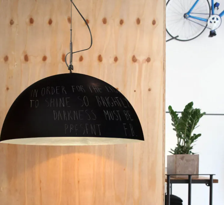En effet, on peut écrire ou dessiner avec une craie sur l’abat-jour fabriqué en Nébulite, matériau unique mis au point à base de résine et de fibres. Ce luminaire nous rappelle véritablement les tableaux noirs de l’école où l’on dessine, on l’on laisse des pense-bêtes…