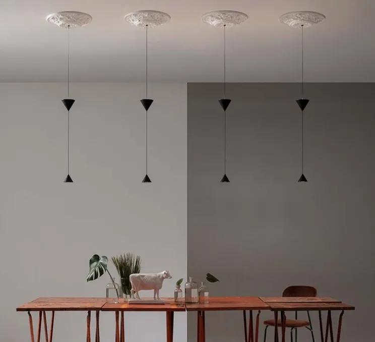 Avec son design léger et minimaliste, cette suspension sera parfaite pour intégrer des espaces modernes ou contemporains. Composée d’une grande rosace en plâtre blanc avec des motifs floraux à laquelle est suspendu un système LED en cônes d’aluminium.