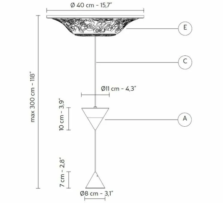 Le système LED d’une puissance totale de 25,2W (top :16,8W et bottom : 8,4W) est intégré et diffuse 2700K et 2728 lumens. Le cône supérieur mesure 11 cm de diamètre et 10 cm de hauteur et le cône inférieur mesure 8 cm de diamètre et 7 cm de hauteur. La rosace a un diamètre de 40 cm. Possède un câble noire ajustable de 3m maximum. Variable en 0-10V. Possède un IRC de 90 promettant un rendu qualitatif des couleurs.